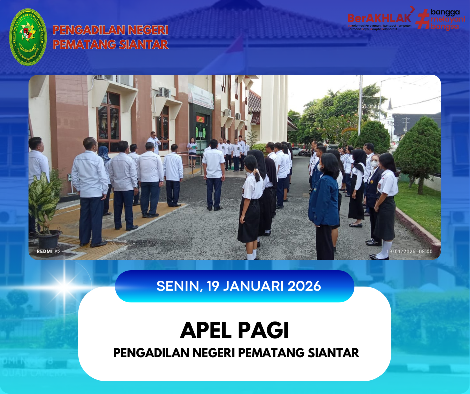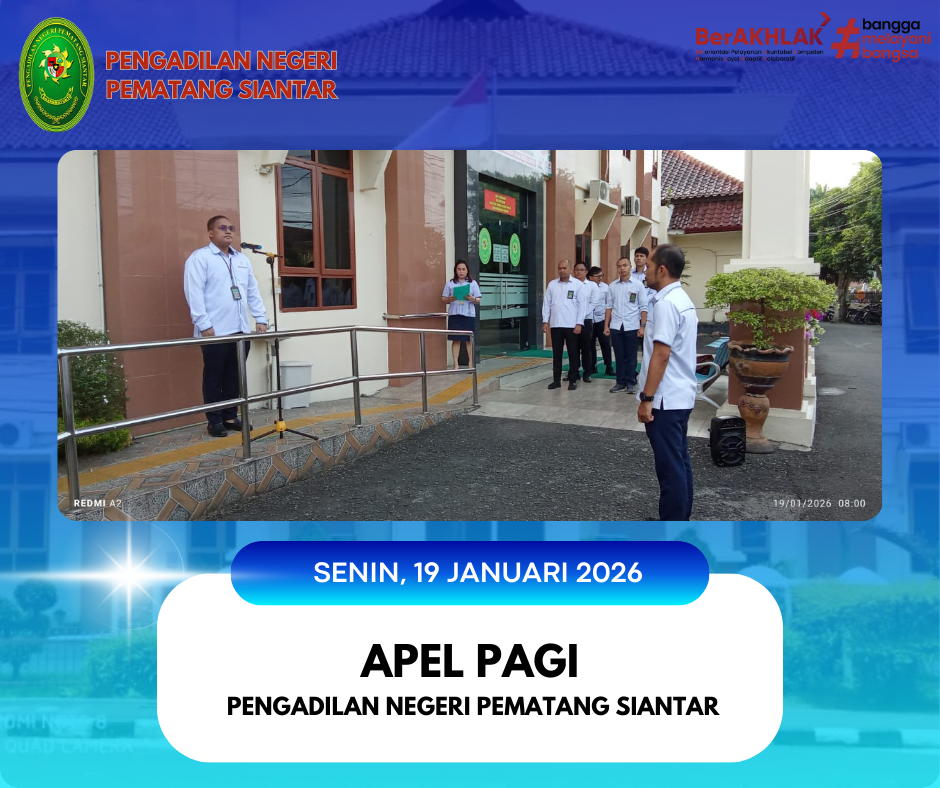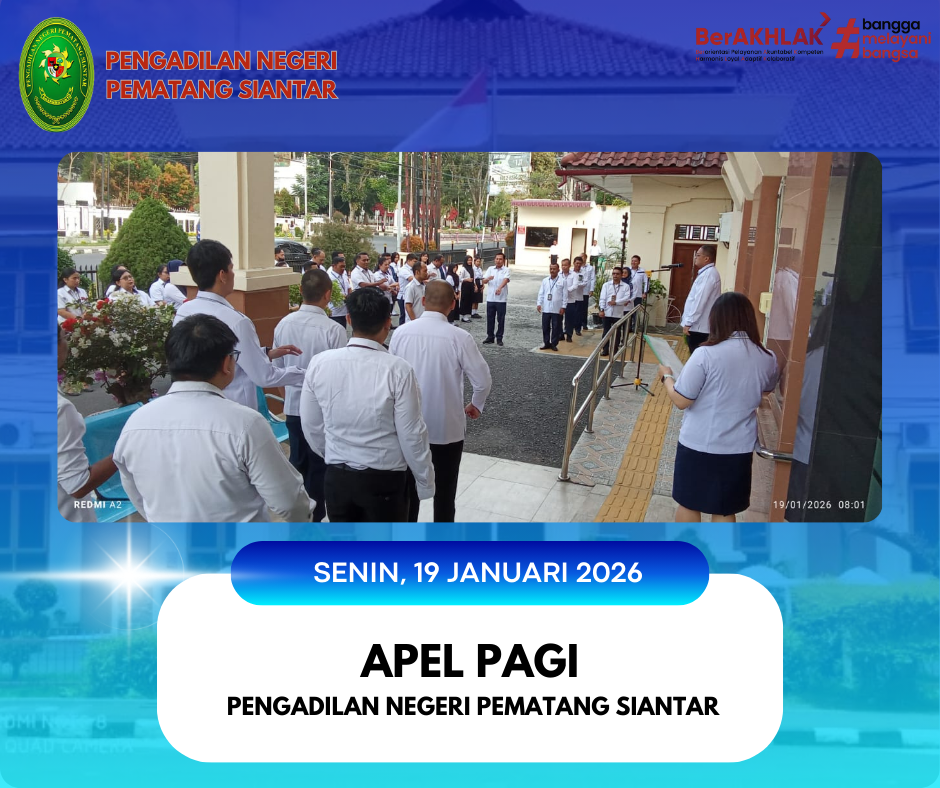 Telah dilaksanakan apel pagi rutin pada Pengadilan Negeri Pematang Siantar yang dipimpin oleh Hakim Pengadilan Negeri Pematang Siantar, Bapak Tigor Hamonangan Napitupulu, S.H., dan dihadiri oleh Hakim, Panitera, Sekretaris, Pejabat Struktural & Fungsional, Pegawai dan PPPK Pengadilan Negeri Pematang Siantar.
