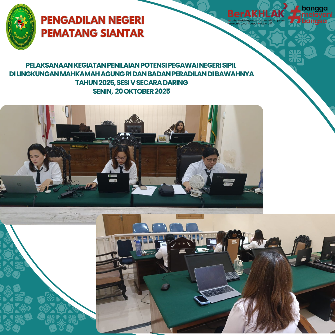 Bertempat di Kantor Pengadilan Negeri Pematang Siantar, telah dilaksanakan Kegiatan Penilaian Potensi Pegawai Negeri Sipil di Lingkungan Mahkamah Agung RI dan Badan Peradilan di Bawahnya Tahun 2025, sesi V secara daring.