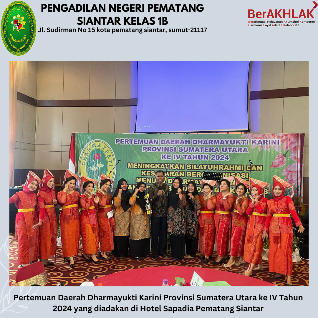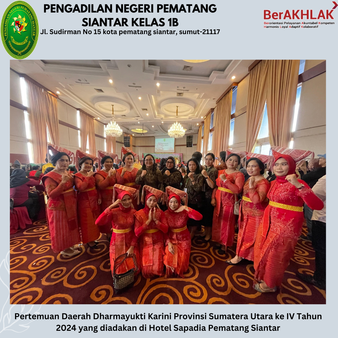 Pematang Siantar- Jumat (12/01/2024), Pengurus Daerah Dharmayukti Karini se-Provinsi Sumatera Utara mengadakan pertemuan rutin dalam rangkaian pertemuan tiga bulanan di Hotel Sapadia, Kota Pematang Siantar. Pada kegiatan tersebut, Ketua Daerah Dharmayukti Karini Provinsi Sumatera Utara Ir. Hj. Endang Setyowati Panusunan Harahap menyampaikan terima kasih kepada DYK Pematang Siantar, DYK Simalungun, DYK Kabanjahe, DYK Sidikalang, dan DYK Balige yang telah bersedia menjadi tuan rumah pada acara Pertemuan Daerah Dharmayukti Karini se-provinsi Sumatera Utara di Kota Pematang Siantar. Dalam Pertemuan Daerah ini juga diisi dengan Sosialisasi "Pembekalan Calon Pimpinan Dharmayukti Karini" yang dibawakan langsung oleh Ketua Daerah Dharmayukti Karini Provinsi Sumatera Utara Ir. Hj. Endang Setyowati Panusunan Harahap.