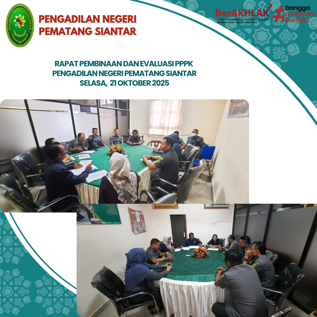 Bertempat di Ruang Mediasi Pengadilan Negeri Pematang Siantar, telah dilaksanakan Rapat Pembinaan dan Evaluasi PPPK Pengadilan Negeri Pematang Siantar. Kegiatan ini dipimpin oleh Sekretaris Pengadilan Negeri Pematang Siantar, Bapak Elixsander Saragih, S.H., dan dihadiri oleh Kepala Sub Bagian Kepegawaian, Organisasi & Tata Laksana, Kepala Sub Bagian Umum & Keuangan, dan PPPK Pengadilan Negeri Pematang Siantar.