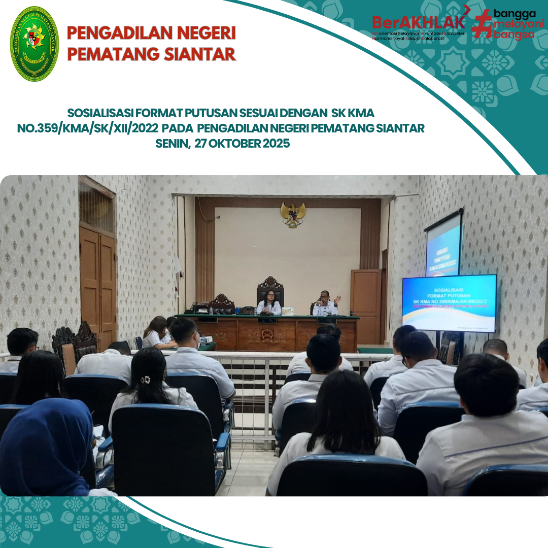 Bertempat di Ruang Sidang Kartika Pengadilan Negeri Pematang Siantar telah dilaksanakan Sosialiasi Format Putusan sesuai dengan SK KMA No. 359/KMA/SK/XII/2022 pada Pengadilan Negeri Pematang Siantar yang dipimpin oleh Ketua Pengadilan Negeri Pematang Siantar, Ibu Rinto Leoni Manullang, S.H., M.H., didampingi Wakil Ketua Pengadilan Negeri Pematang Siantar dan dihadiri oleh Para Hakim, Panitera, Sekretaris dan Pegawai Pengadilan Negeri Pematang Siantar.