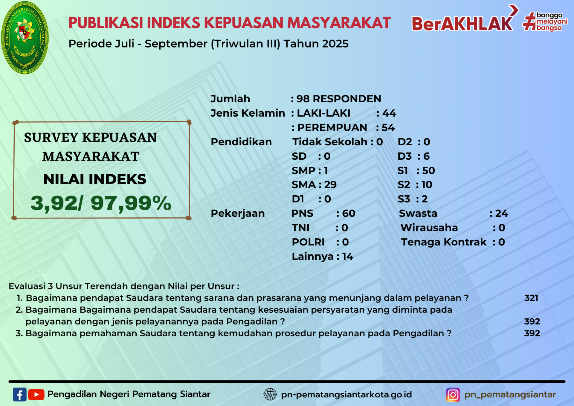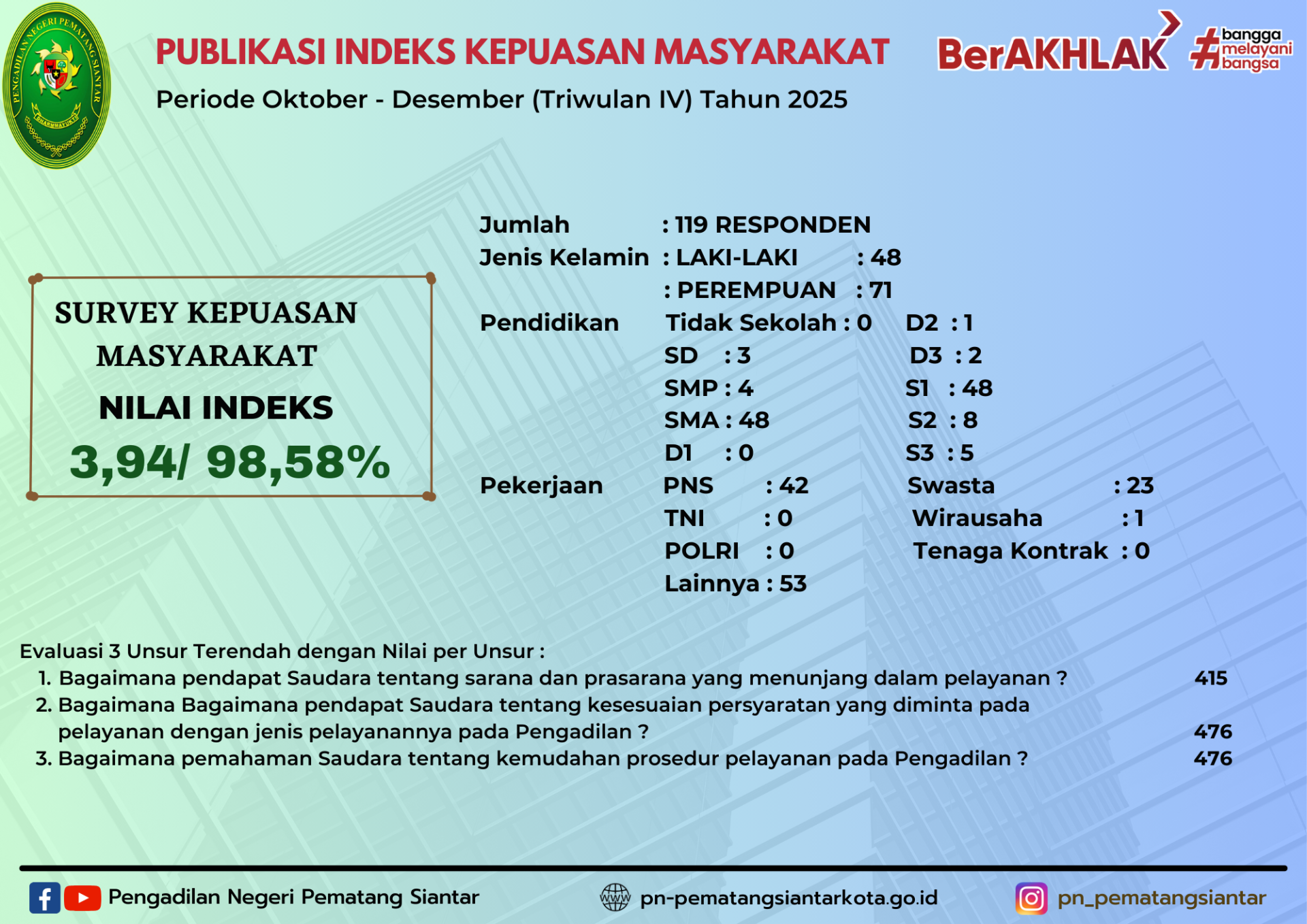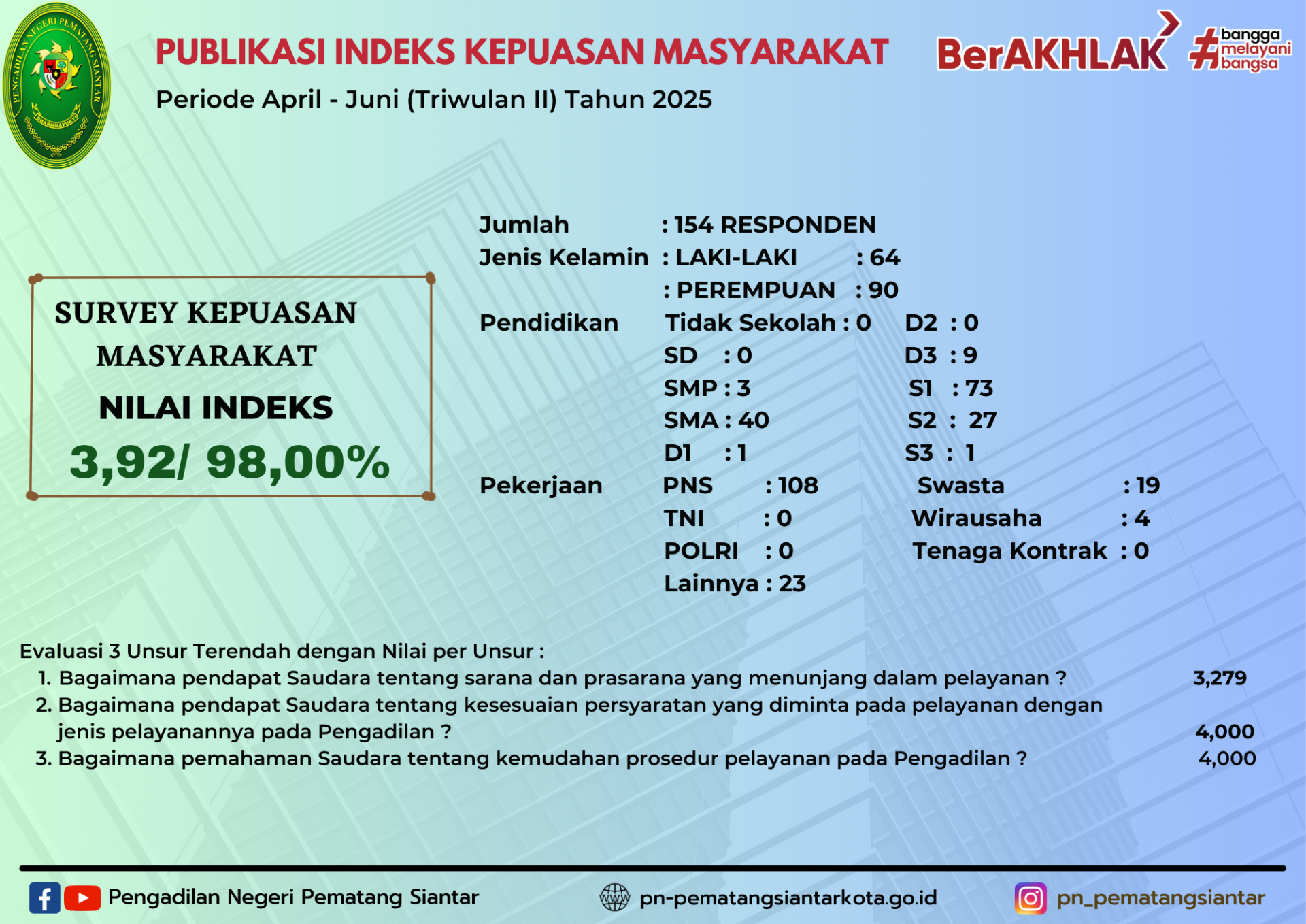 Berikut laporan Hasil Survey Indeks Kepuasan Masyarakat Pengguna Masyarakat Pengguna Pengadilan pada Pengadilan Negeri Pematangsiantar Kelas IB Pematangsiantar